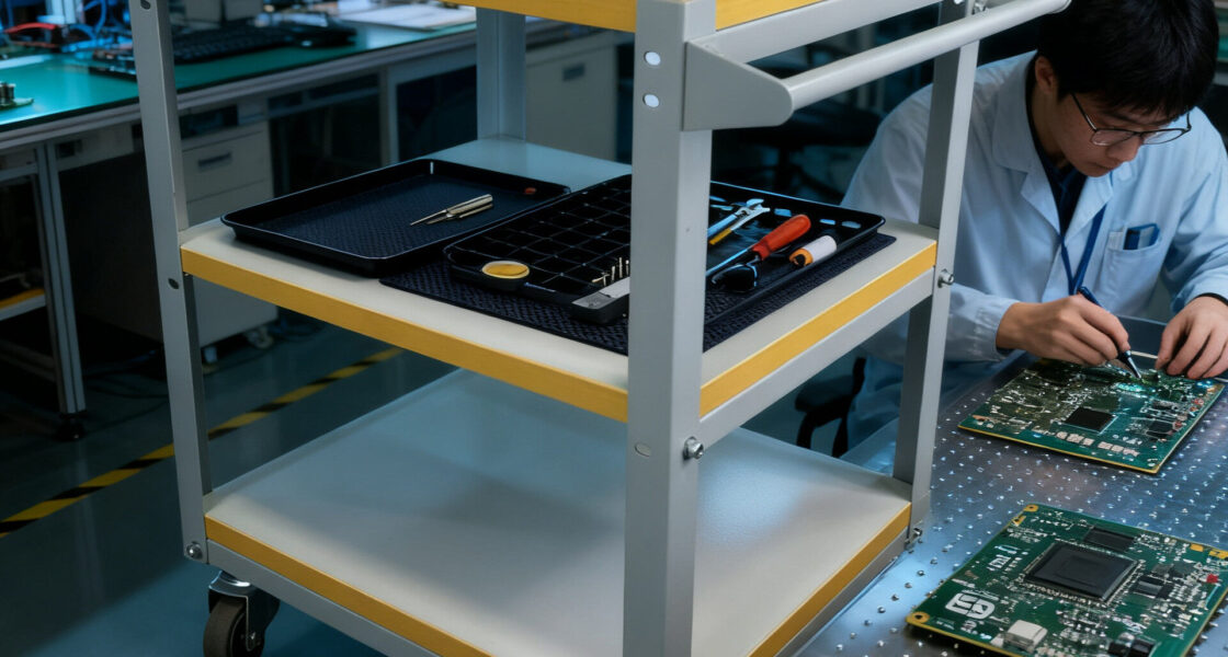 - Assembly & Rework: Transporting sub-assemblies between stations requires an electronics assembly cart with ESD racks.