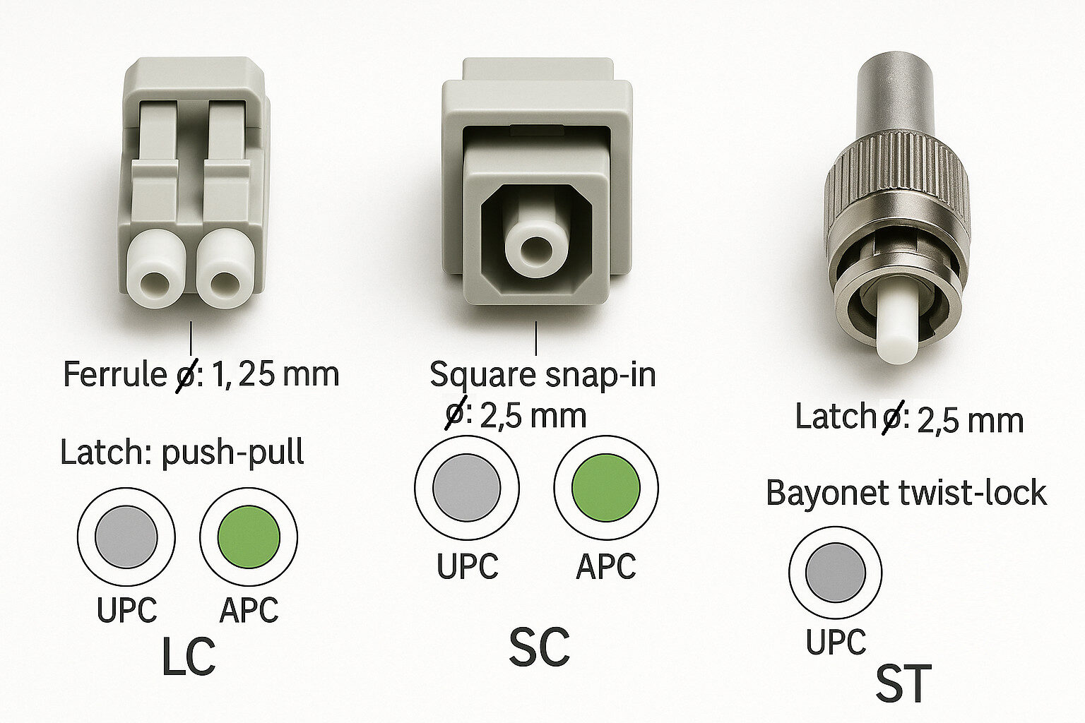 - APC (angled) for PON/backbone and reflection-sensitive links