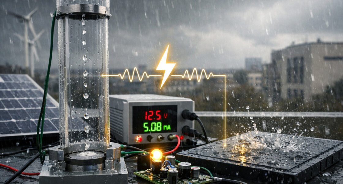 Auch wenn sich diese Technologie noch im experimentellen Stadium befindet, wird die sogenannte hydrovoltaische bzw. triboelektrische Regenenergiegewinnung als möglicher ergänzender Ansatz innerhalb dezentraler Energiesysteme untersucht.