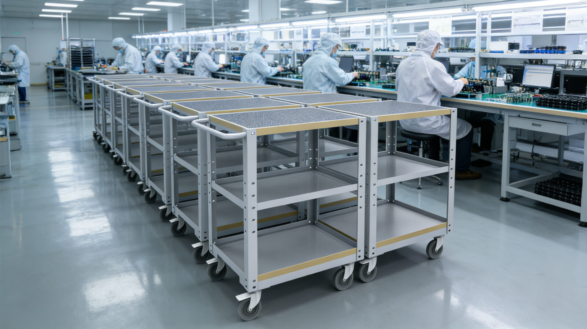 Dies ist der Rhythmus der modernen Elektronikproduktion: ein kontinuierlicher Fluss von Bauteilen, getragen von fahrbaren Wagen und Gestellwagen, die jeweils für eine bestimmte Stufe der Reise ausgelegt sind. Auf jeder Stufe gelten die gleichen Prinzipien: Statik kontrollieren, Erdung aufrechterhalten, das Produkt schützen.