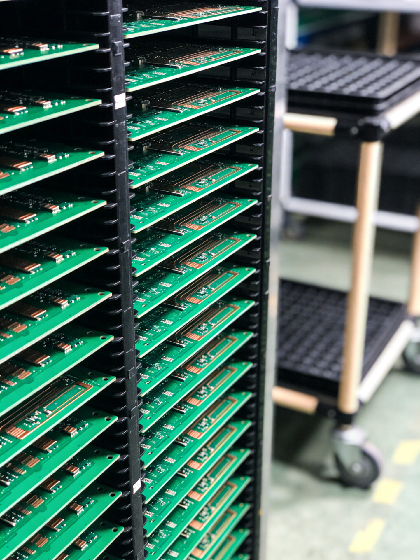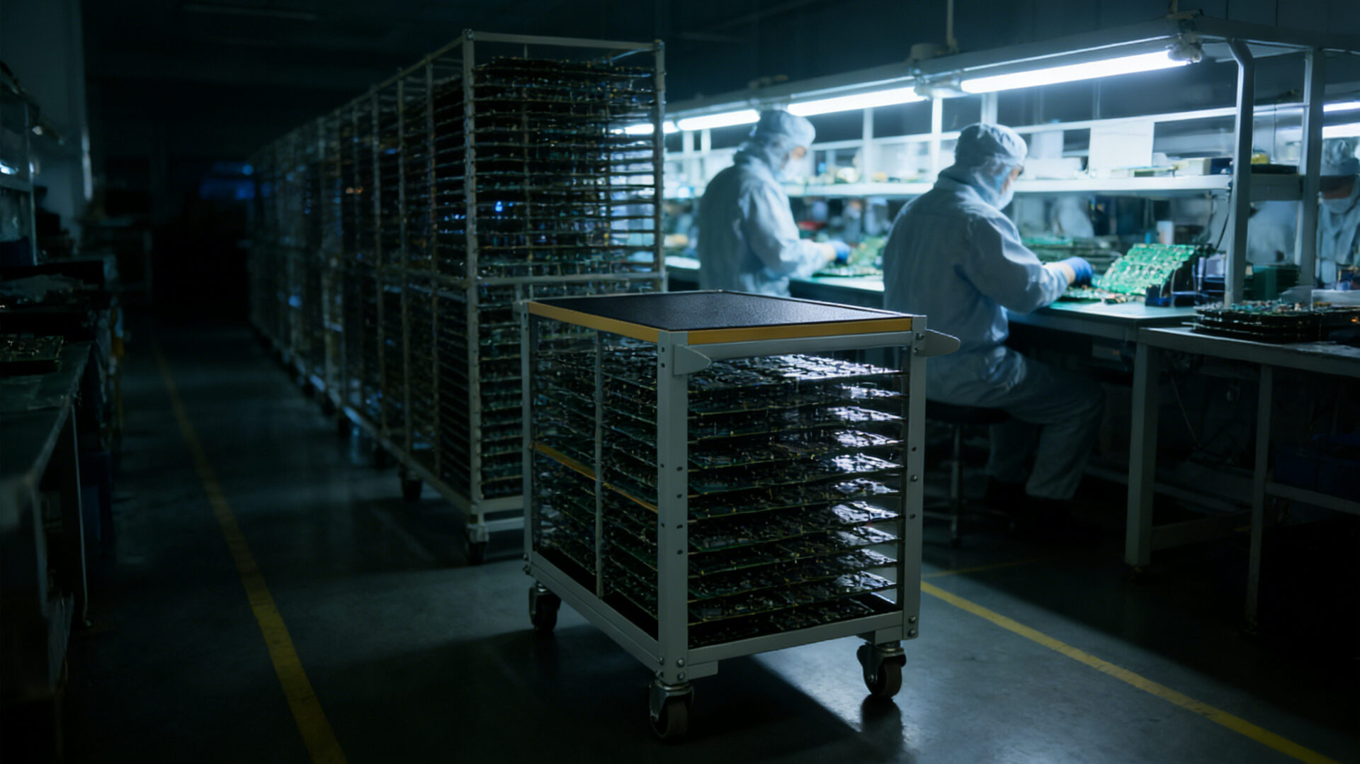 In vielen Elektronikfabriken läuft die Produktion 24 Stunden am Tag, sieben Tage die Woche. Die ESD-Wagen halten nie an. Die Leiterplattenrahmen werden ständig beladen und entladen. Die ESD-Transportwagen bewegen sich mitten in der Nacht durch die Gänge und transportieren Bauteile, die zur morgigen Unterhaltungselektronik werden.