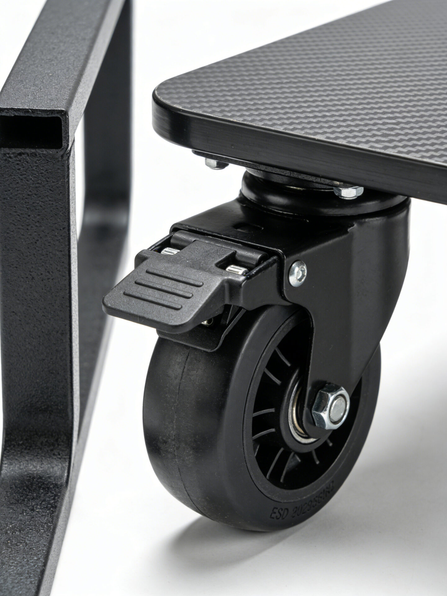 Aus der Lagerung laden die Bediener die Platinen auf einen ESD-Tablettwagen. Dieser Wagen verfügt wie alle ESD-Transportwagen über eine ESD-Laminat-Oberfläche – eine Arbeitsfläche, die Statik ableitet, anstatt sie sich aufbauen zu lassen. Sein Rahmen ist mit einer ESD-pulverbeschichteten Metalloberfläche versehen, einer speziellen Beschichtung, die leitfähige Partikel enthält und die gesamte Struktur in einen Pfad zur Erde verwandelt. Darüber hinaus rollt er auf ESD-Universalrollen aus leitfähigem Gummi, die sicherstellen, dass selbst die Bewegung keine Statik erzeugt. Zwei dieser Rollen sind mit Rollen mit Feststellern – oder Lenkrollen mit Feststeller – ausgestattet, sodass der Wagen, wenn er stoppt, genau dort bleibt, wo Sie ihn brauchen.