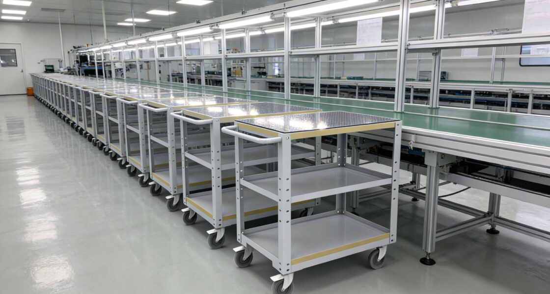 - Von der Leiterplattenlagerung bis zur Endmontage ist jede Stufe der Elektronikproduktion auf fahrbare Wagen und Gestellwagen angewiesen, um empfindliche Bauteile zu transportieren, ohne statische Schäden zu verursachen.